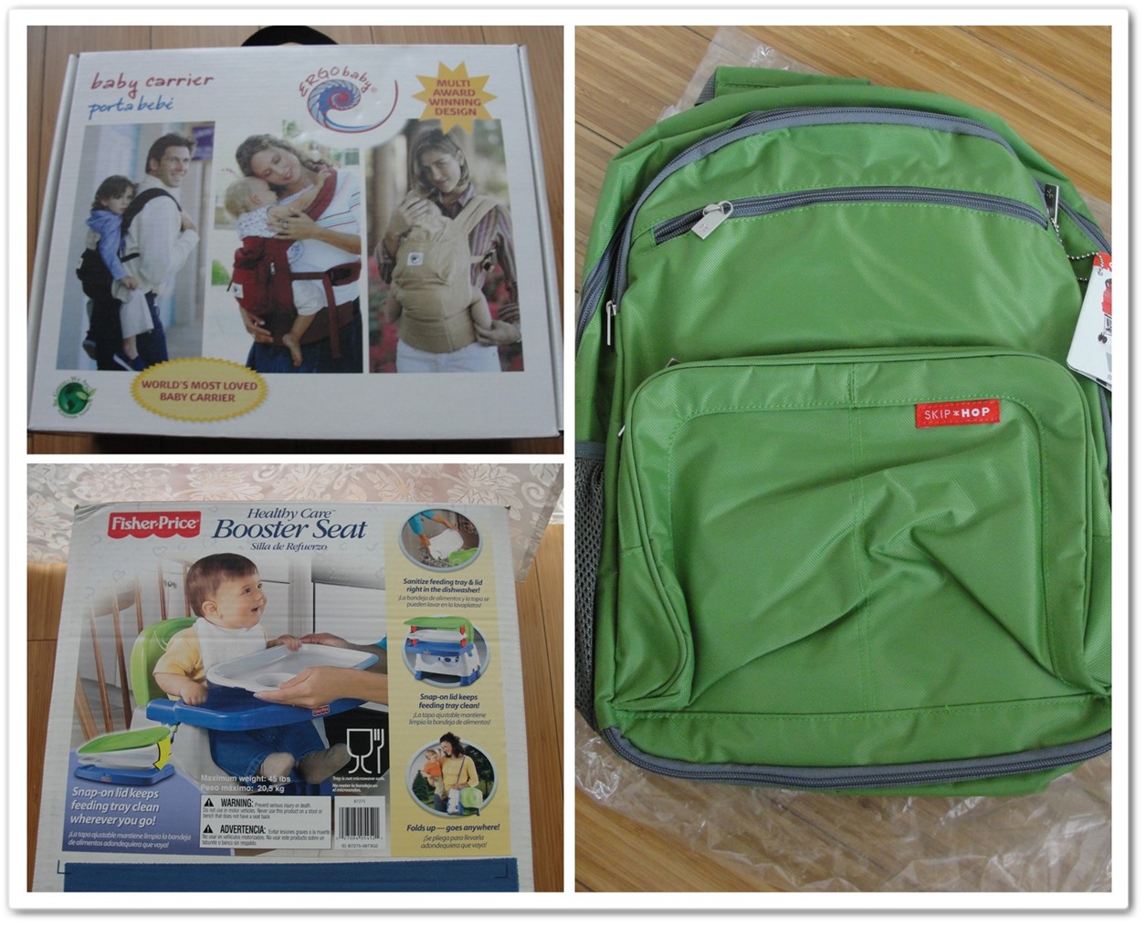 Kado nya pake special request pula. Hihihihi. Dan bukan cuma 1 kadonya tapi 3!! Ada diaper bag nya Skip Hop (ini bener-bener diaper bag idaman nih. Karena bentuknya backpack (gua gak suka sling bag), bentuknya keren, bisa isi macem-macem, dan warna ijo nya mantep bener! Love it!), gendongan Ergo Baby (ini juga gendongan idaman karena dikasih tau temen kalo gendongan ini enak banget dan gak bikin pinggang encok, udah gitu gua liat dimana-mana juga sekarang orang-orang pada pake gendongan ini ya… Jadi kayaknya emang ok nih… Btw, udah gua cobain nih gendongannya… buat ngegendong Andrew! Hihihihi), dan kursi makan Fisher Price (yang ini karena gua ngeliat ipar gua pake ini dan keliatan kokoh dan praktis buat dibawa-bawa).