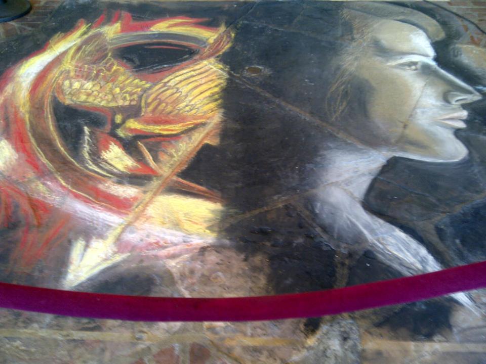 Seru nonton screening begini… Dari depan bioskop aja poster The Hunger Games nya udah ada dimana-mana. Trus yang keren, di depan pintu masuk bioskopnya ada seniman yang ngegambar logo The Hunger Games ama Katniss pake kapur di lantai! Asli tadi karena gua datengnya kepagian (gua dateng jam 5 aja gitu, padahal filmnya mulai jam 7! Aji mumpung, bisa kabur cepet dari kantor kan… :P) jadi gua sempet ngeliat pas itu orang masih ngegambar.