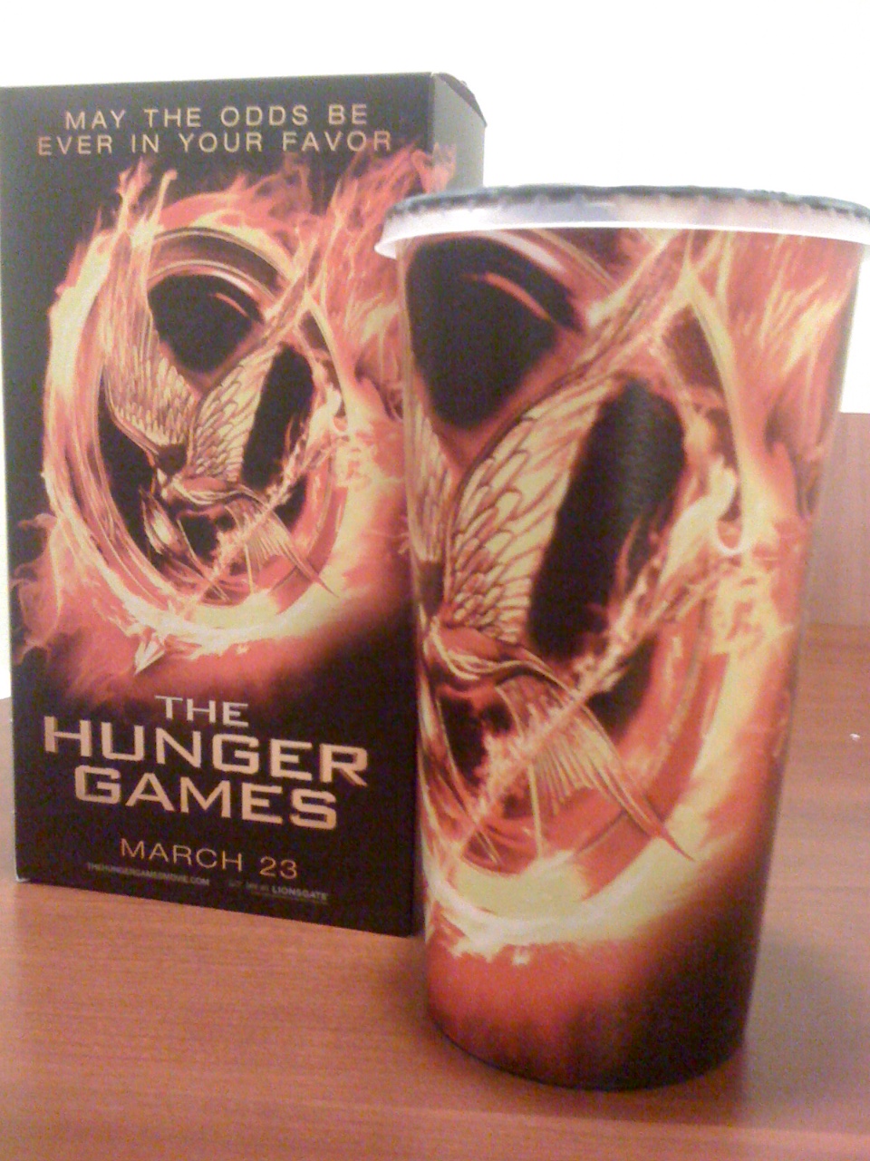 Trus yang juga keren, di dalem disediain pop corn dan minuman yang mana kantong pop corn ama gelas minumannya semua serba The Hunger Games juga dong!! Gelasnya gelas plastik pula, jadi bisa dipake lagi! 😀