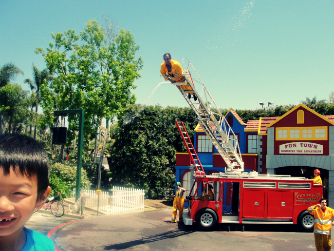 Sebenernya ke Legoland kali ini sih gua pengennya kita main rides yang dulu kita belum pernah main. Eh tapi si Andrew pengen main disini lagi. Ya udah deh kita main lagi. Jadi ya kita naik fire truck, kudu ngadu balapan supaya maju ke depan sampe ke depan bangunan yang terbakar, trus kita turun dan nyemprotin air ke bagian yang kebakaran sampe apinya padam, baru kudu balik lagi naik truck untuk balik ke posisi semula.