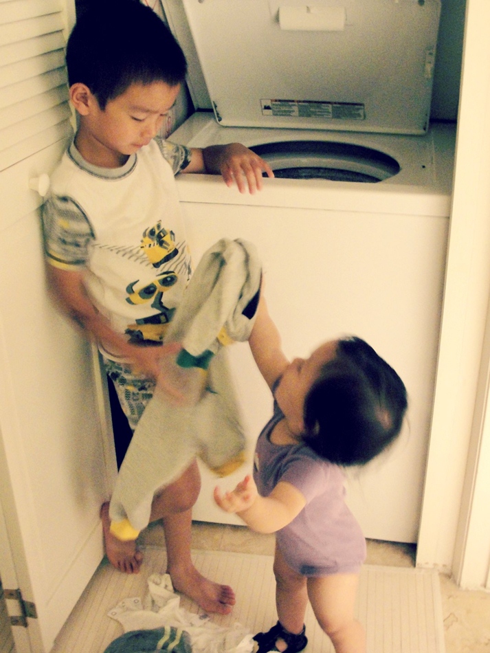 Anak kecil tuh demen banget ya kalo disuruh ngejarin kerjaan orang gede, salah satunya ya do laundry. Lucu dah si Esther kan udah milah-milah baju yang mau dicuci dan ditaruh di lantai. Trus Emma yang ngambilin bajunya dari lantai, dikasih ke Andrew, dan Andrew yang masukin ke dalem mesin cuci. Demen banget mereka bisa ngebantuin kita nyuci baju. 😀