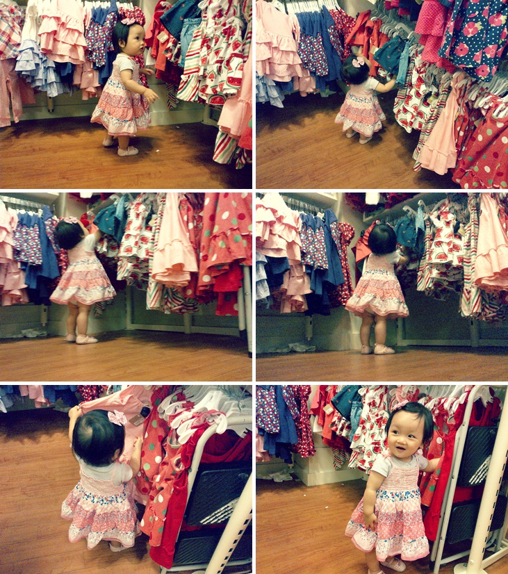 Si Emma jalannya sekarang udah semakin lancar, jadi di mal pun dia maunya jalan sendiri mulu. Dan begitu masuk toko baju dong… Dia langsung ke rak-rak dan… milih-milih baju!
