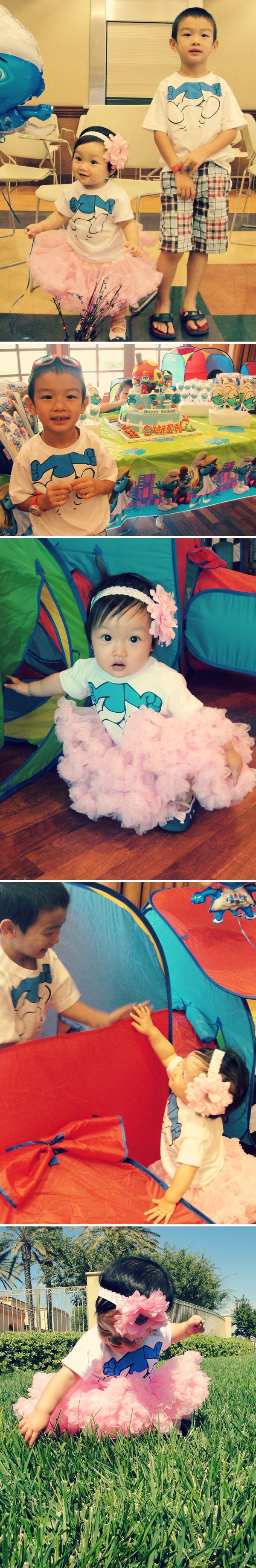 Siangnya kita pergi ke pesta ulang tahun anak temen. It’s a Smurf party! Kebetulan Andrew ama Emma punya baju Smurf kembar, dikasih cici gua, jadi pas nih bisa dipake… 🙂