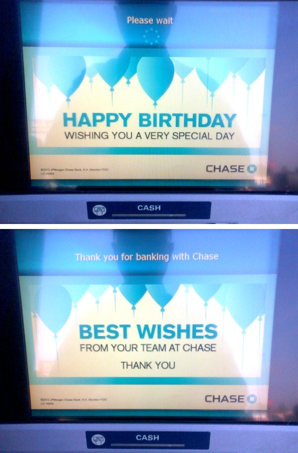 Iya ATM yang Auto Teller Machine tempat ngambil duit itu! Jadi ceritanya beberapa hari setelah gua ultah, gua ngambil duit di ATM. Begitu masukin password, langsung muncul tulisan Happy Birthday! Trus setelah kelar transaksi, keluar tulisan Best Wishes.