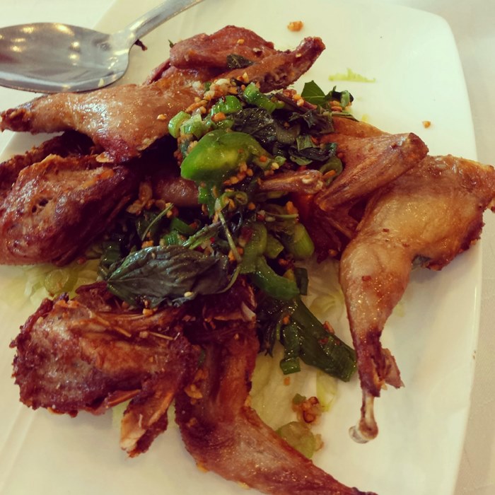 Dengan mantap kita mesen House Special Jumbo Quails. Harganya $6 dapet 2 ekor. Wuiii murah banget ya. Pas udah mesen, gua baru ngeh trus ngomong ke Esther, quail itu kan burung puyuh ya… bukan burung dara! Haiyaaa pantesan aja murah. Burung puyuh kan kecil banget. Emang ada dagingnya apa? 😛