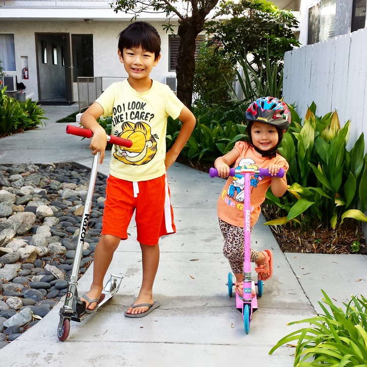 andrew udah jago main scooter nya jadi udah gak pake helm lagi. emma baru belajar jadi masih mesti pake. hahaha.