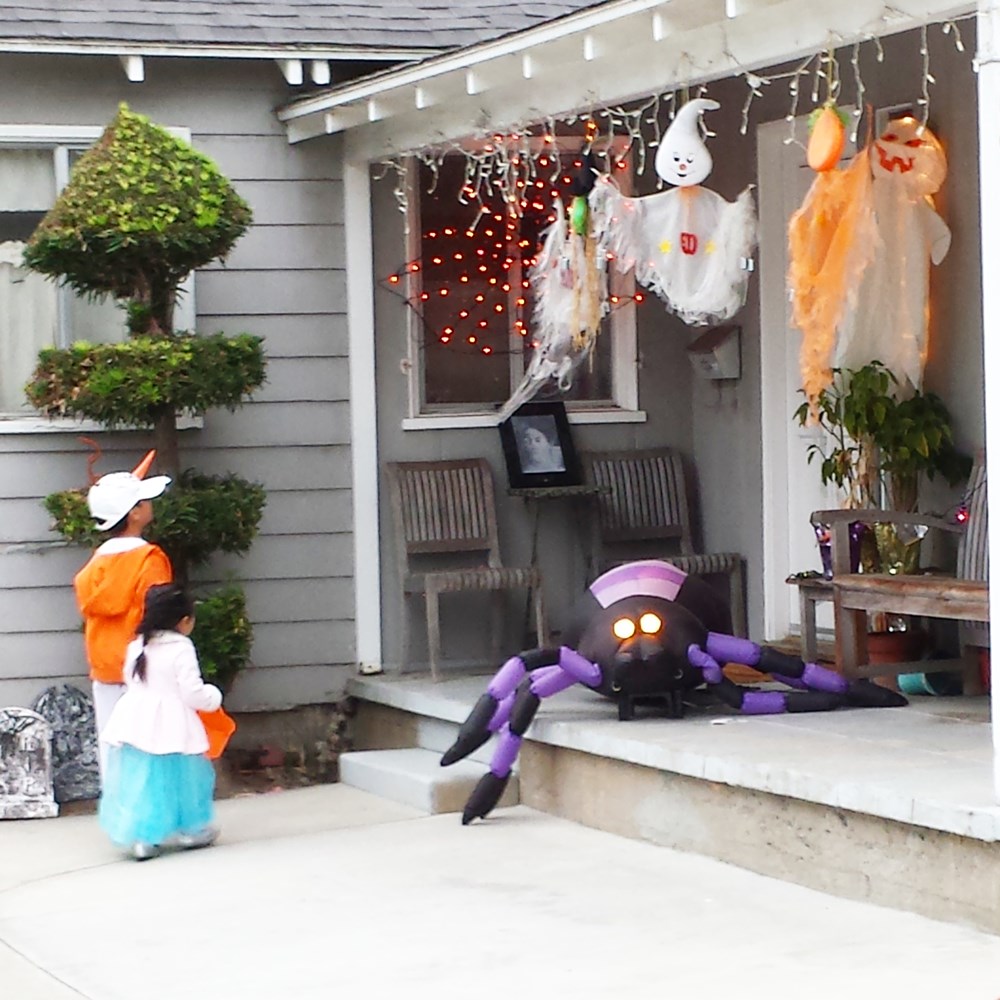 Padahal spider nya gak nyeremin at all ya? :p Tapi pas mereka udah deket, eh ternyata spider nya bisa gerak. Si Emma langsung kabur dah gak jadi ngetok pintunya. Hahaha. Trus pas ke rumah lain ada juga yang masang spider yang sama, si Emma kabur lagi… 😛