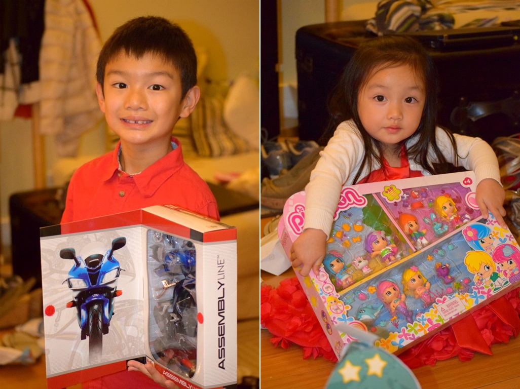 Trus ya sampe rumah dikasih hadiah dah. Andrew minta dibeliin mainan sepeda motor yang mesti dipasang-pasang sendiri dan Emma minta dibeliin Pinypon. They were well deserved! 😀