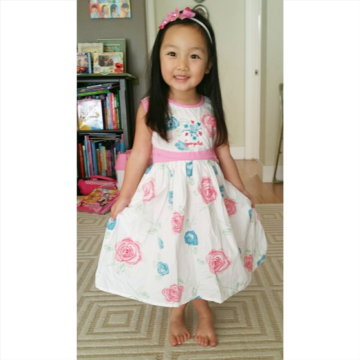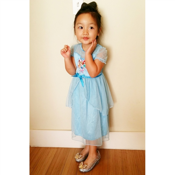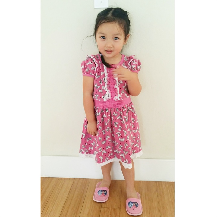 Emang kalo punya anak cewek bawaannya pengen beli-beliin baju mulu ya. Ini gaun pesta kita beli cuma sekedar karena bagus dan harganya ok. Padahal dipikir-pikir mau dipake kemana? Orang kita disini gak pernah diundang ke pesta kecuali pesta ulang tahun. Gak cocok juga kan pake gaun begini? Hahaha.