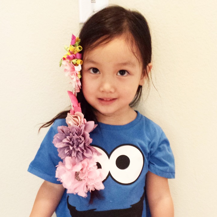 Emma masih suka banget ama Disney princesses. Gak ada bosen-bosennya ya. Hampir tiap malem minta diceritain Disney princess. Padahal udah hafal mati cerita-ceritanya tapi tetep aja suka denger lagi dan lagi. 😀 Trus tentu juga masih suka pura-pura jadi princess juga. Salah satunya di foto di atas ini gimana rambutnya dipakein banyak bunga-bunga, itu awalnya dia sendiri lho yang pake (belakangan trus dibantuin Esther), karena dia mau jadi Rapunzel! 😛