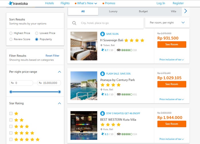 Fitur yang paling suka tuh karena bisa di-sort berdasarkan harga dan juga berdasarkan review score! Ngebantu banget kan tuh buat kaum banyak maunya tapi gak banyak duitnya kayak kita begini. 😛 Trus banyak diskon nya pula, jadi lebih murah jatohnya dibanding beli langsung ke hotelnya. Apalagi kalo belinya paket tiket pesawat sama hotel, jatohnya jadi lebih murah. Coba klik disini dah!
