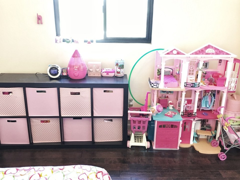 Di sisi yang lain kita taruh book shelf dan dipakein kotak-kotak warna pink buat nyimpen mainannya Emma. Book shelf nya ditidurin posisinya biar si Emma gampang ngambil mainannya. Dan tentu Barbie house nya juga bersemayam di kamar si Emma (yang dulunya di rumah lama bersemayam di living room, di rumah baru living room kita gak ada mainan bergeletakan lagi! :D). Sampe humidifier nya pun kita beli warna pink. Ngeliat ini jadi pink overdose ya! Hahaha. 😛