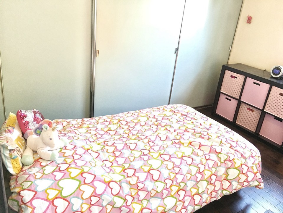 Di sebrang ranjangnya itu ada dresser dan book shelf buat naruh mainan-mainannya.