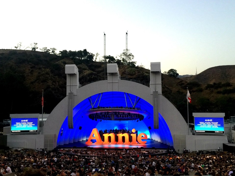 3. Oh ya, kalo keliatan di panggungnya ada tulisan ANNIE segede gaban itu bukan sekedar tulisan. Jadi berhubung Hollywood Bowl ini adalah concert venue, bukan buat theater jadi mereka gak bisa pake backdrop. Jadi buat ngakalin biar bisa ada setting di tiap-tiap adegan, itu huruf nya bisa diputer dan bisa dijadiin interior nya. Kayak huruf A itu kayak attic di panti asuhan, ntar huruf lain ada yang kayak di rumahnya Warbucks, dan lain-lain. Kreatif banget dah. Selain itu, bagian tengah panggungnya juga bisa rotasi, jadi di belakang huruf-huruf itu ada platform yang bisa dibikin kayak setting outdoor kalo pas lagi adegan di outdoor kota New York gitu. Keren banget dah. Jadi lain daripada yang lain. 😀