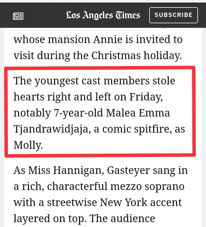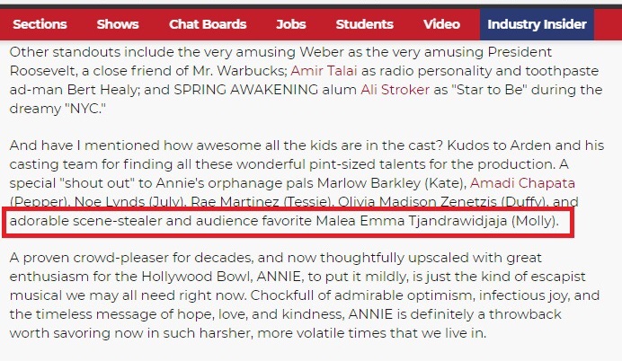 Belum lagi yang komen-komen di Instagram, banyak banget yang bilang si Emma stole the show. Ada juga 2 Youtube video yang gua nemuin nge-review Annie. Mereka cuma nyebut yang bagus tuh ya para bintang besar kayak Lea Salonga, Megan Hilty dan… Molly (karakter nya Emma)! 😀