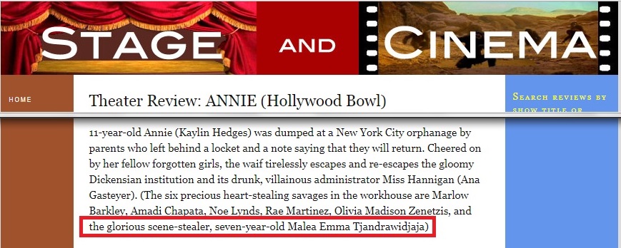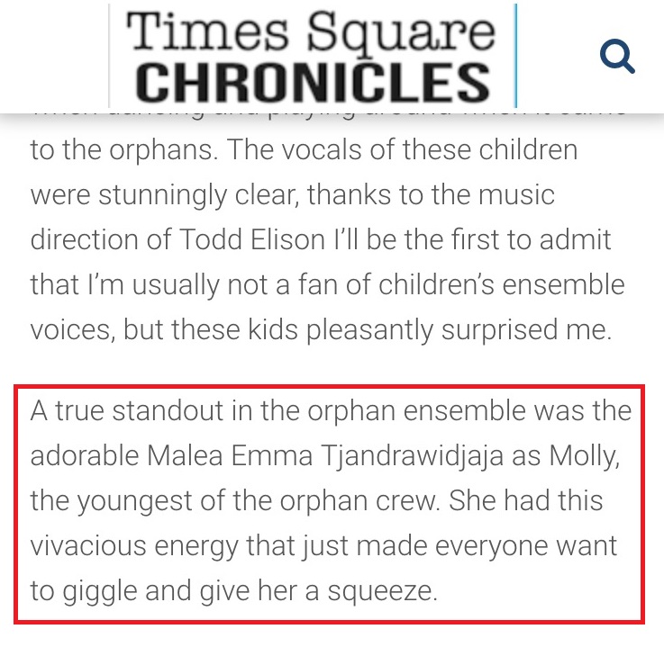 Tapi eh tapi… setelah pertunjukan yang pertama kelar dan review pertama keluar… nama Emma disebut dong! Gak main-main nih review nya dari Broadway World dan dia nulis begini tentang Emma “adorable scene-stealer and audience favorite“! Pas baca kalo si Emma sampe dapet review gitu gua sampe nangis lho! Call me lebay tapi bangganya luar biasa rasanya…