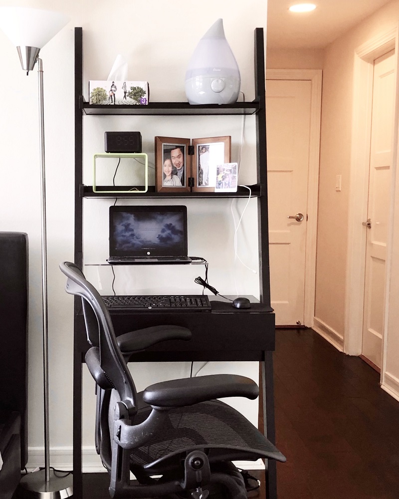 Seneng deh sekarang kalo meeting gak perlu pindah-pindah tempat lagi. Gak perlu pake earphone, tinggal pake speaker aja. Modelnya gua juga suka, model ladder yang ada rak-rak nya. Jadi barang-barang yang tadinya ada di nakas gua bisa ditaruh di rak-rak ini. Nakas nya sendiri sekarang pindah ke kamar Emma.
