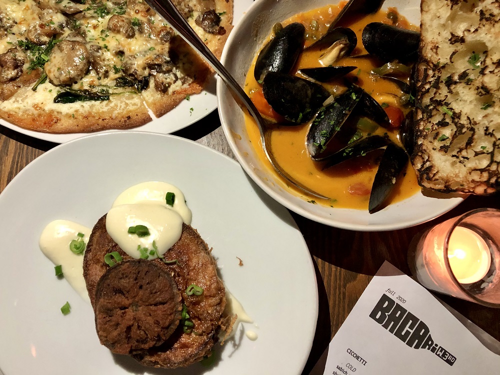 Makanannya pun enak-enak! Kita mesen smoked mushroom pizza, lamb stuffed eggplant dan mussels bowl. Enak-enak semua, terutama pizza nya!
