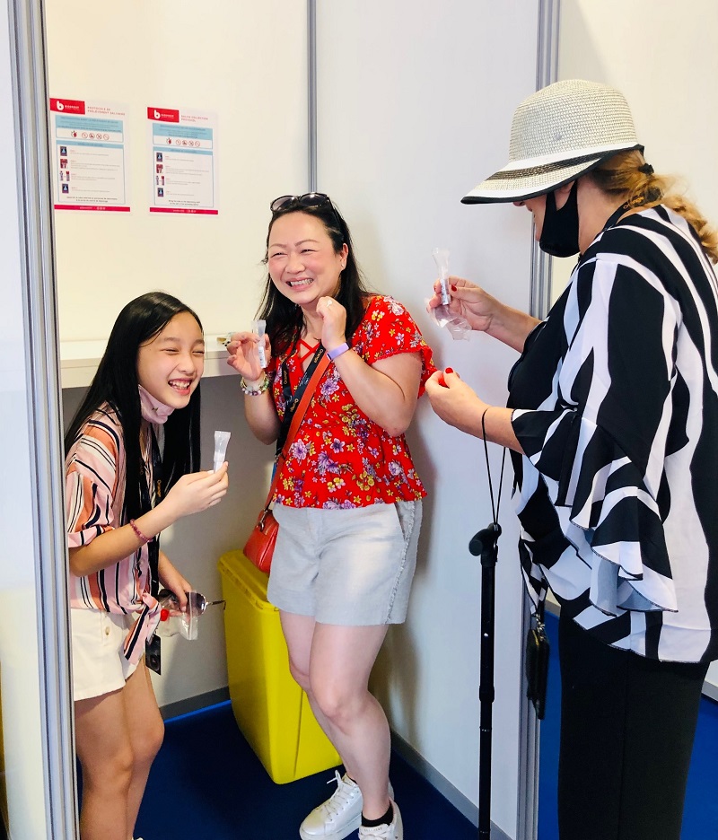 Btw, hasil covid test nya negative semua jadi lega! Tapi masalahnya kita pada lupa pake sunblock yang mana kita jadi gosong semua! Si Emma jidatnya sampe item belang. Pegimana besok mau photo call dan jalan di red carpet? Haiyaaaa…. 😛