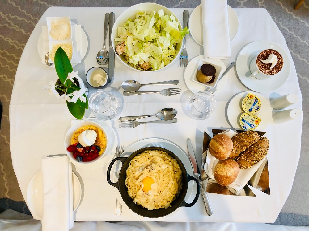 Berhubug masih ada sisa makanan dari siang (pizza dan kerang yang enak banget itu!), dari room service kita cuma pesen chicken salad, pasta, creme brulee dan tiramisu. Again makanan hotel ini enak enak banget. Saladnya kita emang udah tau enak. Pasta nya itu juga enak banget! Plus porsi nya gede banget pula.